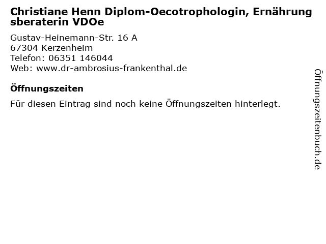 | Christiane Henn Diplom-Oecotrophologin, Ernährungsberaterin VDOe anrufen | |