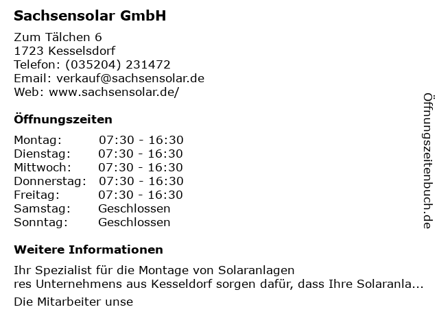 | Öffnungszeiten Sachsensolar GmbH in Kesselsdorf anzeigen | |