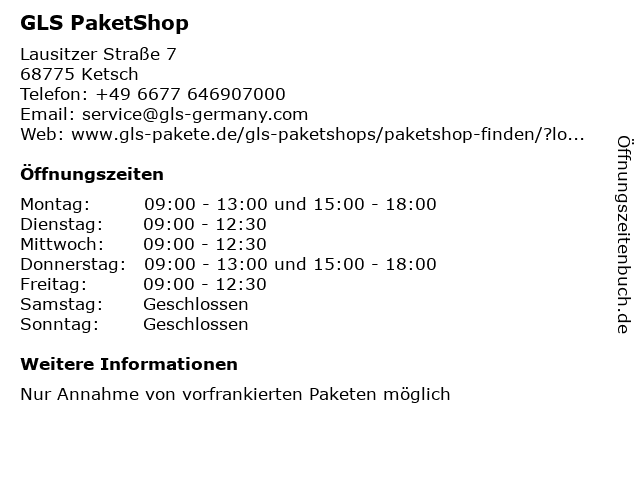 | Telefonnummer GLS PaketShop in Ketsch (+49 6677 646907000) anrufen | |