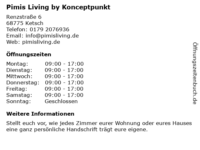 | Öffnungszeiten Pimis Living by Konceptpunkt in Ketsch anzeigen | |