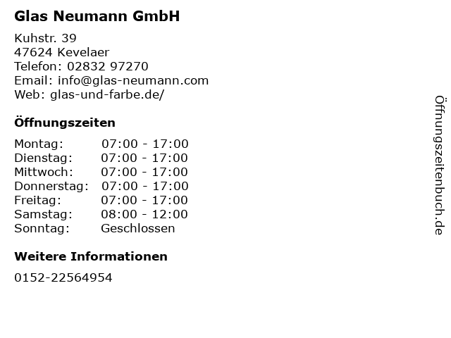 | Öffnungszeiten Glas Neumann GmbH in Kevelaer anzeigen | |