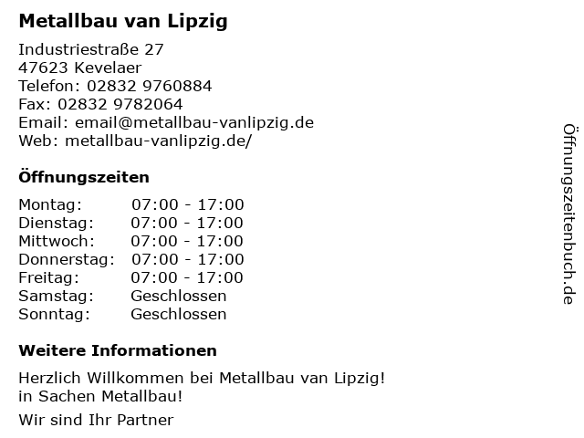 | Öffnungszeiten Metallbau van Lipzig in Kevelaer anzeigen | |