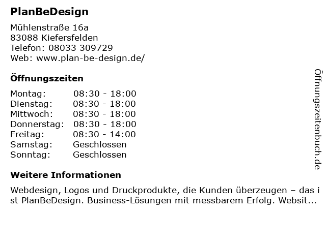 | Öffnungszeiten PlanBeDesign in Kiefersfelden anzeigen | |