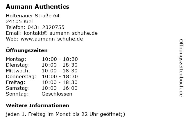 | Öffnungszeiten Aumann Authentics in Kiel anzeigen | |
