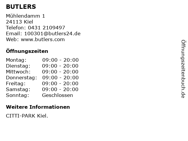 | Öffnungszeiten BUTLERS in Kiel anzeigen | |