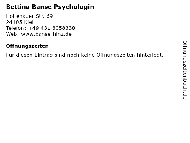 | Öffnungszeiten Bettina Banse Psychologin in Kiel anzeigen | |