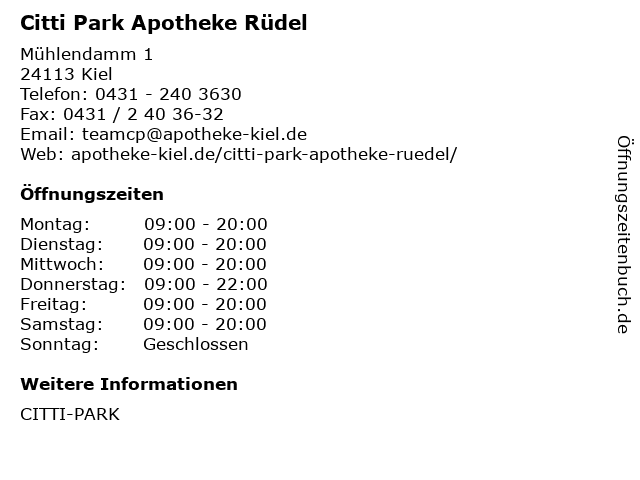 | Öffnungszeiten Citti Park Apotheke Rüdel in Kiel anzeigen | |