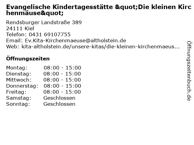 1 Evangelische Kindertagesstätte "Die Kleinen Kirchenmäuse" (Entfernung: 1,19 km) Vorderkronsberg 22, 24113 Kiel 3 Evangelische Stadtmission Kiel e.V. Wilhelm-Lorenz-Haus/Altenpflegeheim (Entfernung: 2,31 km) Schulenhof 1, 24113 Molfsee 5 Evangelische Bank - Vertriebsdirektion Nord (Entfernung: 4,54 km) Herzog-Friedrich-Str. 45, 24103 Kiel 6 Evangelische Studentenheime in Kiel e.V. Wohnheime (Entfernung: 5,43 km) Klosterkirchhof 2, 24103 Kiel |