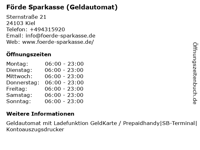 | Öffnungszeiten Förde Sparkasse (Geldautomat) in Kiel anzeigen | |