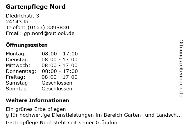 | Öffnungszeiten Gartenpflege Nord in Kiel anzeigen | |