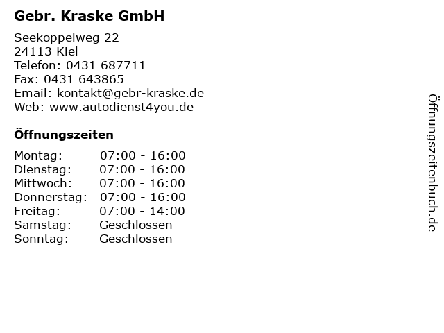 | Öffnungszeiten Gebr. Kraske GmbH in Kiel anzeigen | |