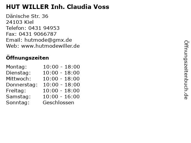 | Öffnungszeiten HUT WILLER Inh. Claudia Voss in Kiel anzeigen | |