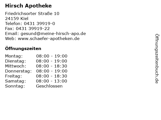 | Öffnungszeiten Hirsch Apotheke in Kiel anzeigen | |