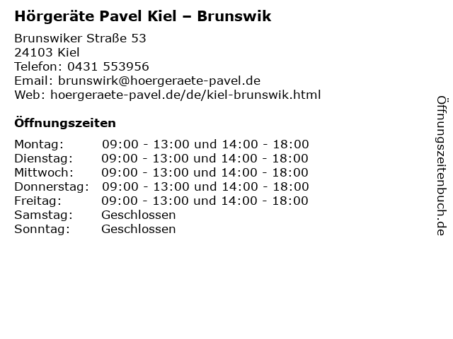 | Öffnungszeiten Hörgeräte Pavel Kiel – Brunswik in Kiel anzeigen | |