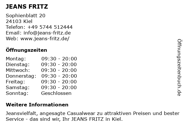 | Öffnungszeiten JEANS FRITZ in Kiel anzeigen | |