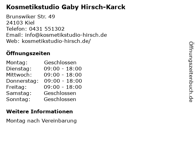 | Öffnungszeiten Kosmetikstudio Gaby Hirsch-Karck in Kiel anzeigen | |