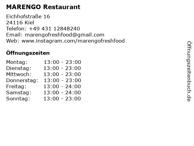 | Öffnungszeiten MARENGO Restaurant in Kiel anzeigen | |