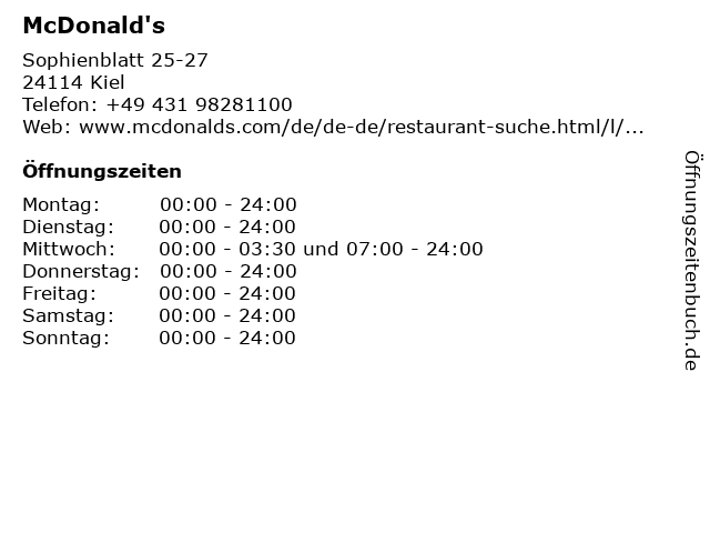 | Öffnungszeiten McDonald's in Kiel anzeigen | |