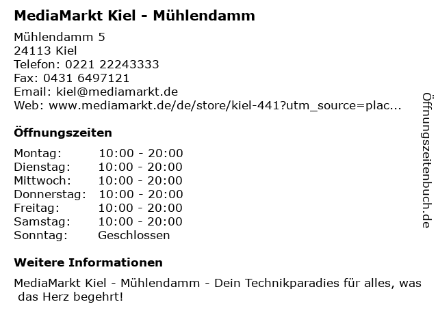 Öffnungszeiten MediaMarkt Kiel - Mühlendamm in Kiel anzeigen | |