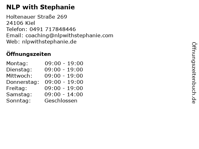 | Öffnungszeiten NLP with Stephanie in Kiel anzeigen | |