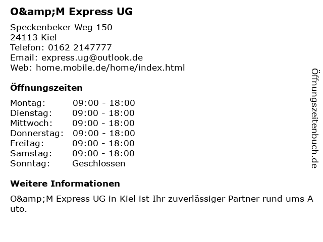 | Öffnungszeiten O&M Express UG in Kiel anzeigen | |