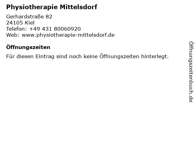 | Öffnungszeiten Physiotherapie Mittelsdorf in Kiel anzeigen | |