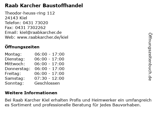| Öffnungszeiten Raab Karcher Baustoffhandel in Kiel anzeigen | |
