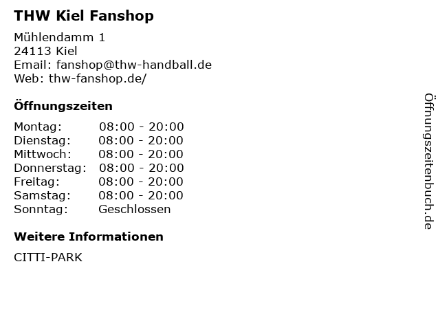| Öffnungszeiten THW Kiel Fanshop in Kiel anzeigen | |