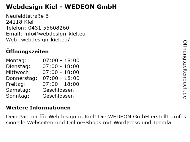 | Öffnungszeiten Webdesign Kiel - WEDEON GmbH in Kiel anzeigen | |