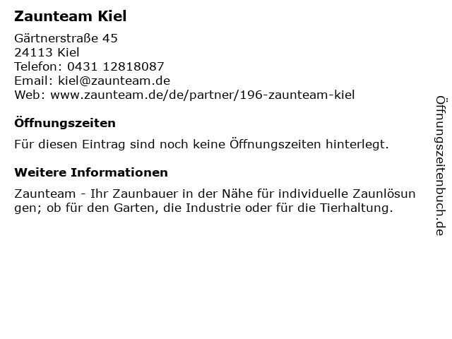 | Öffnungszeiten Zaunteam Kiel in Kiel anzeigen | |