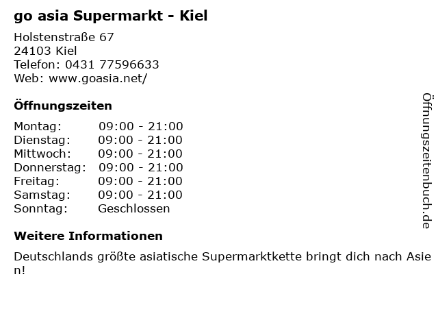 | Öffnungszeiten go asia Supermarkt - Kiel in Kiel anzeigen | |