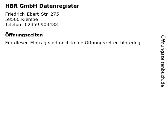 | Öffnungszeiten HBR GmbH Datenregister in Kierspe anzeigen | |