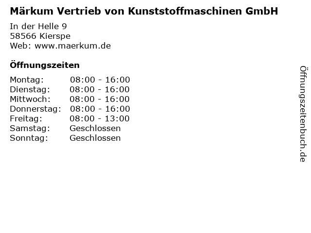 | Öffnungszeiten Märkum Vertrieb von Kunststoffmaschinen GmbH in Kierspe anzeigen | |