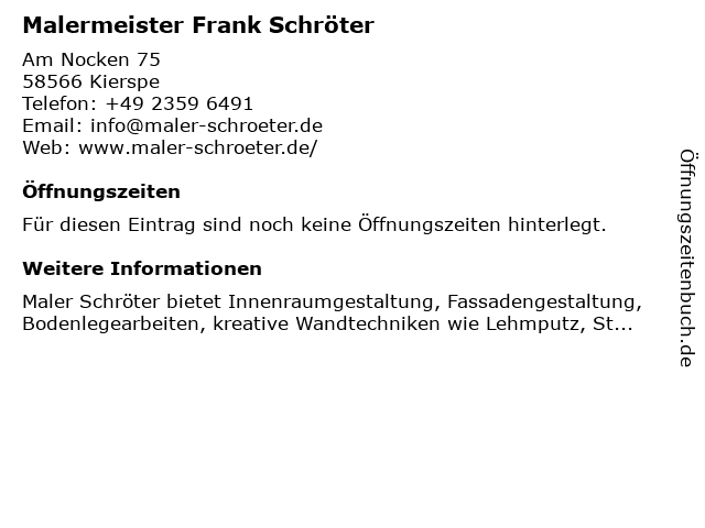| Öffnungszeiten Malermeister Frank Schröter in Kierspe anzeigen | |