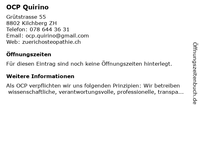 | Öffnungszeiten OCP Quirino in Kilchberg ZH anzeigen | |