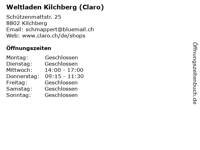 | Öffnungszeiten Weltladen Kilchberg (Claro) in Kilchberg anzeigen | |