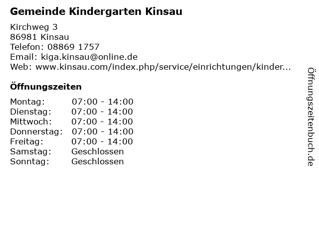 | Öffnungszeiten Gemeinde Kindergarten Kinsau in Kinsau anzeigen | |