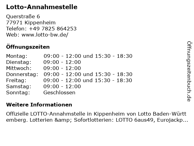 | Öffnungszeiten Lotto-Annahmestelle in Kippenheim anzeigen | |
