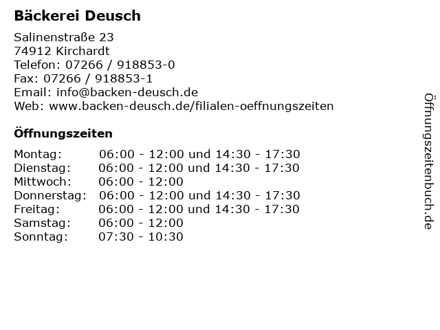 | Öffnungszeiten Bäckerei Deusch in Kirchardt anzeigen | |