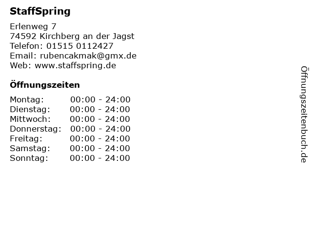 | Öffnungszeiten StaffSpring in Kirchberg an der Jagst anzeigen | |
