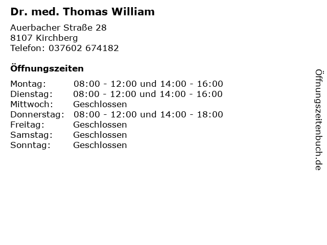| Öffnungszeiten Dr. med. Thomas William in Kirchberg anzeigen | |