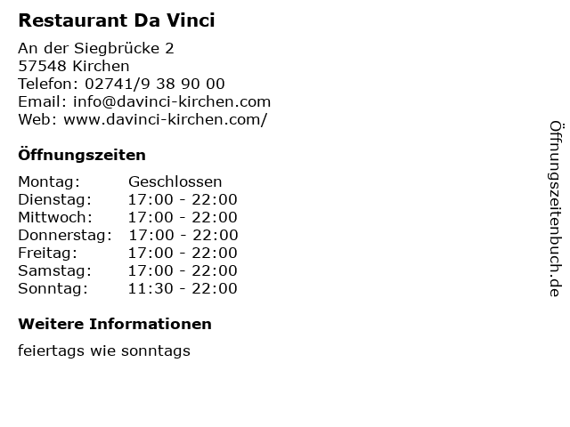| Öffnungszeiten Restaurant Da Vinci in Kirchen anzeigen | |