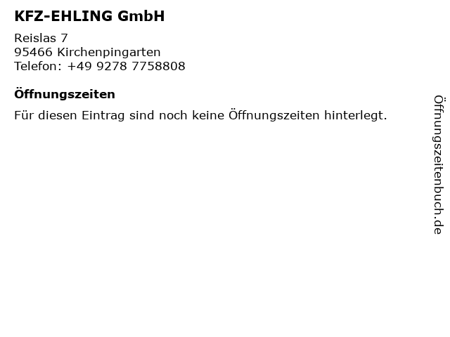 | Öffnungszeiten KFZ-EHLING GmbH in Kirchenpingarten anzeigen | |