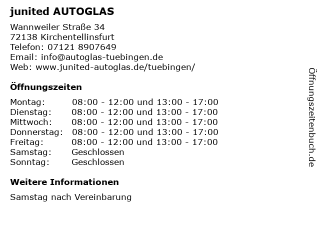 | Öffnungszeiten junited AUTOGLAS in Kirchentellinsfurt anzeigen | |