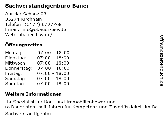 | Öffnungszeiten Sachverständigenbüro Bauer in Kirchhain anzeigen | |