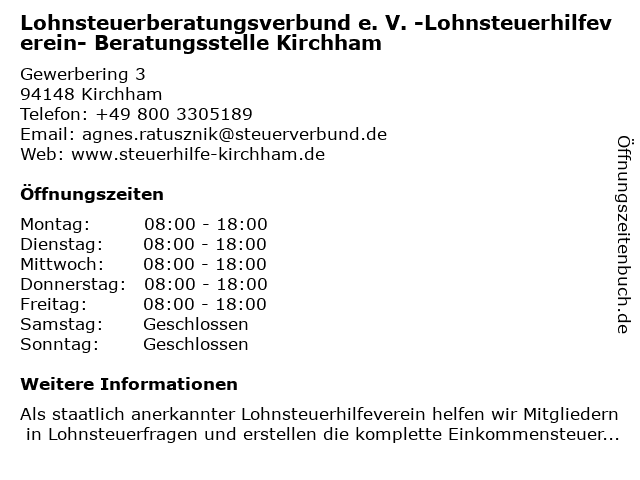 2 Lohnsteuerberatungsverbund e. V. -Lohnsteuerhilfeverein- Beratungsstelle Pocking (Entfernung: 7,75 km) Am Stadtplatz 1, 94060 Pocking 4 5 Lohnsteuerhilfeverein HILO e.V. - Beratungsstellenleiterin Bettina Ehgartner (Entfernung: 9,16 km) Ed bei Münchham 4a, 94140 Ering 6 Lohnsteuerhilfeverein HILO e.V. - Beratungsstellenleiterin Janina Kaczynska (Entfernung: 11,58 km) Lindauer Weg 4a, 94099 Ruhstorf |