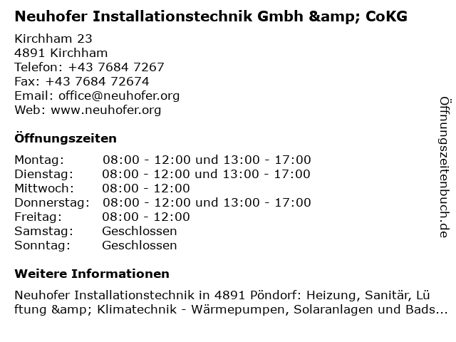 5 Felix Neuhofer . Dachdecker-, Spenglermeister u. Glaser - Bürozeiten (Entfernung: 12,35 km) Sportplatzstraße 4, 5202 Neumarkt am Wallersee 6 Mayer Installationstechnik GmbH & Co KG (Entfernung: 13,39 km) Hauptstraße 25, 4872 Neukirchen an der Vöckla |