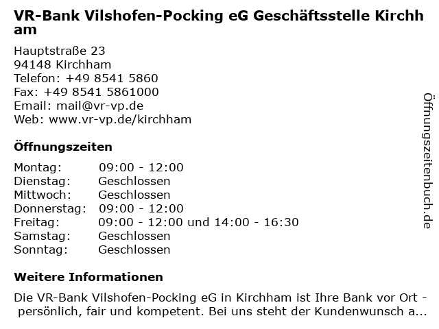 Branchen & Suchbegriffe zu VR-Bank Vilshofen-Pocking eG Geschäftsstelle Kirchham:bank, baufinanzierung, eg, geldanlage, geldautomat, geschäftsstelle, girokonto, immobilien, kirchham, kredit, kreditkarte, online-banking, versicherung, vr |
