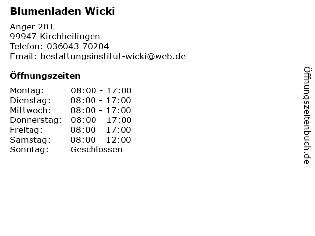 | Öffnungszeiten Blumenladen Wicki in Kirchheilingen anzeigen | |
