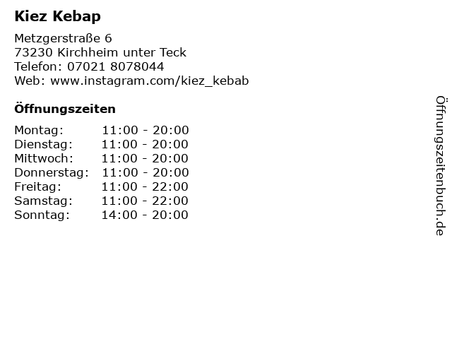| Öffnungszeiten Kiez Kebap in Kirchheim unter Teck anzeigen | |